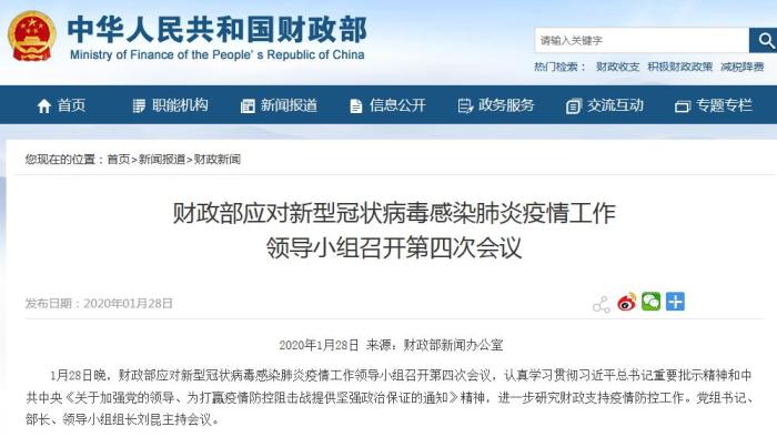 中新网客户端1月28日电(李金磊) 1月28日晚,财政部应对新型冠状病毒感染肺炎疫情工作领导小组召开第四次会议。截至28日下午地方各级财政已安排218亿元用于疫情防控。要密切关注疫情发展态势,进一步加强财政支持措施研究,及时完善疫情防控财税措施,加大财力保障。合理调度资金,确保不因经费问题影响疫情防控工作。
