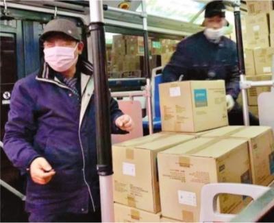 28日凌晨4时许,公交549路驾驶员一起将医疗物资搬上公交车。通讯员刘培 摄