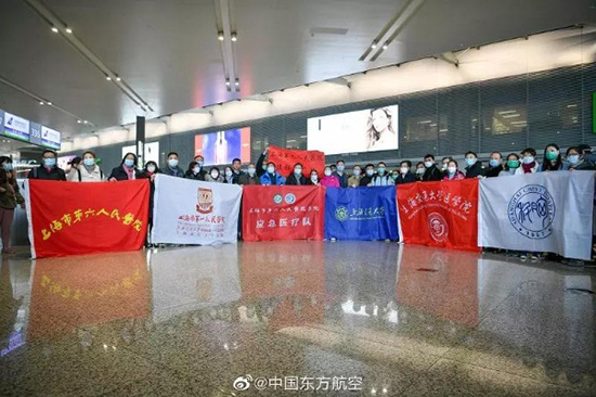 1月28日17时53分,东航第九架包机从上海再次起飞,载着上海第三批援鄂医疗队共148人及医疗救护物资803件11.7吨,紧急驰援武汉。