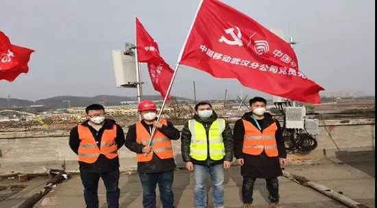 中国移动成功开通火神山5G高清手机实时直播通道现场。