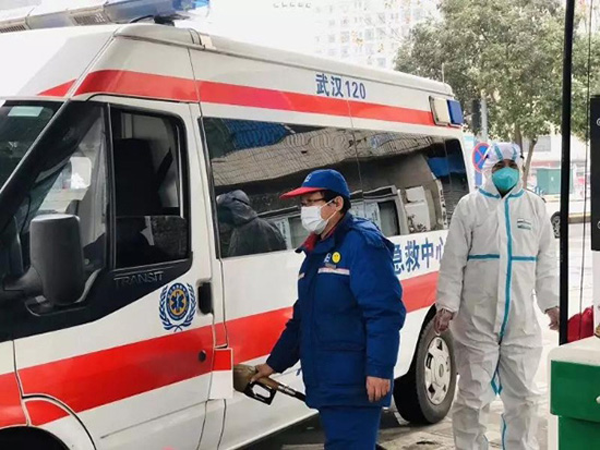 中国石化湖北武汉石油菱角湖加油站员工为救护车辆加油。