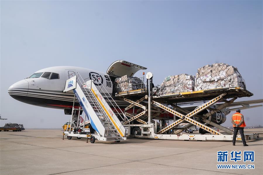 1月28日,一架满载援助物资的货运飞机在武汉天河国际机场卸货。新华社记者 程敏 摄