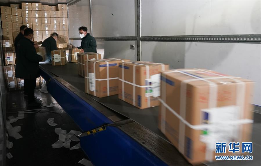 1月27日,武汉邮区中心局邮件处理中心的职工在卸货分拣援助物资。 新华社记者 程敏 摄
