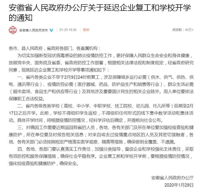 此外,安徽省内各级各类学校(高校、中小学、中职学校、技工院校、幼儿园、托儿所等)延期至2月17日之后开学。此前,学校不得组织学生返校,不得组织任何形式的线下集中教学活动和集体活动。具体开学时间,将根据疫情防控情况,经科学评估后确定,并提前向社会公布。