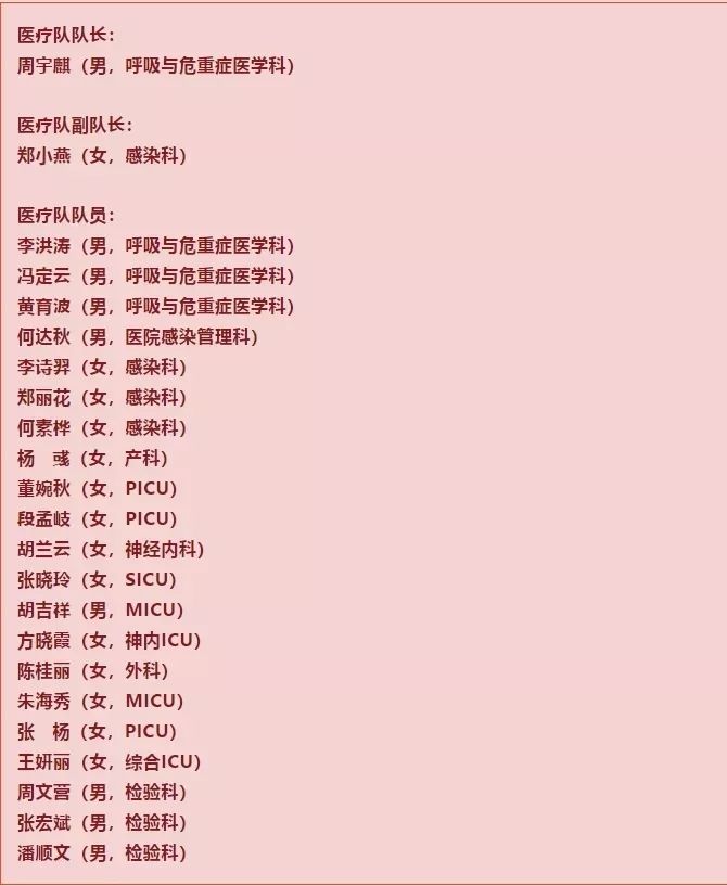 第一批队员是感染科副主任医师徐斌,重症医学科护士长汪慧娟和华山医院北院重症医学科护师刘蓉、姜华。第二批队员是重症医学科副主任医师赵锋,重症感染科护师徐惠和华山医院北院重症医学科护师汤晶、吴问香。第三批队员是呼吸科副主任医师章鹏,重症医学科护师倪健和华山医院北院重症医学科护师沈青、曹倩。