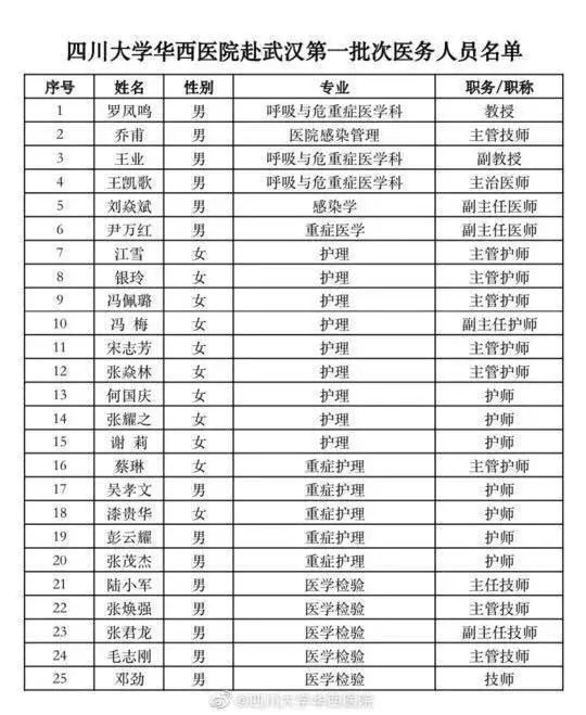 目前,来自四川大学华西医院感染管理部、呼吸与危重症医学科、重症医学科、感染性疾病中心等部门的第一批25名医护人员已飞赴武汉。这25名队员分别来自呼吸与危重症医学科、重症医学科、感染性疾病中心、实验医学科等专业的医务人员,其中5名医师、14名护师、5名技师,均是自愿报名参加医疗队。其中,华西医院感控专家乔甫今日清晨先行出发赶赴武汉疫情前线开展工作。此外,华西医院第二批次队员也在集结中。