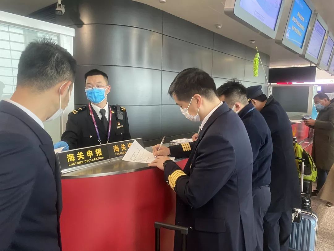 (郑州海关所属机场海关关员王肖锋正在引导机组人员填写《健康申明卡》,郑州海关供图。)