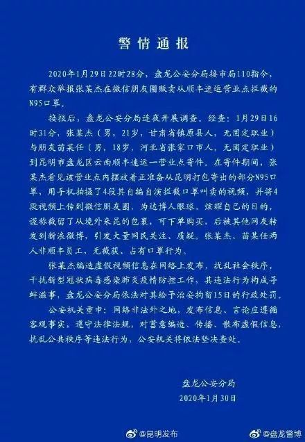1月29日,有网友发布消息称,有顺丰快递员私自“截获”客户口罩销售,针对此事,云南省昆明盘龙公安分局1月30日发布通报称,2020年1月 29日 22时 28分,盘龙公安分局接市局 110指令,有群众举报张某杰在微信朋友圈贩卖从顺丰速运营业点拦截的N95口罩。