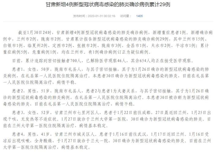 中新网1月31日电 据甘肃省卫健委网站消息,截至1月30日24时,甘肃新增4例新型冠状病毒感染的肺炎确诊病例,新增重症患者1例。新增确诊病例中,兰州市2例、陇南市2例。甘肃累计报告新型冠状病毒感染的肺炎确诊病例29例,其中兰州市15例、白银市1例、临夏州2例、定西市2例、张掖市2例、陇南市3例,金昌市1例,天水市2例,平凉市1例;累计重症病例5例,危重病例1例,均在兰州市。有1例确诊病例订正为疑似病例。
