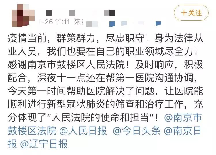 ——这是1月26日大年初二,一位案件代理人发的一条微博留言。原来25日深夜,鼓楼区法院值班干警接到了一位代理人提出可否立即解封账户的申请。法官经核实该医院急需采购相关医疗设备的事实及材料,并第一时间联系原告后,原告表示充分理解,法官依法进行了远程解封,确保该医院新冠肺炎筛查治疗工作得以顺利进行。