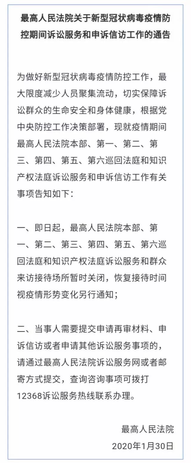 1月30日,最高人民法院发布关于新型冠状病毒疫情防控期间诉讼服务和申诉信访工作的通告。