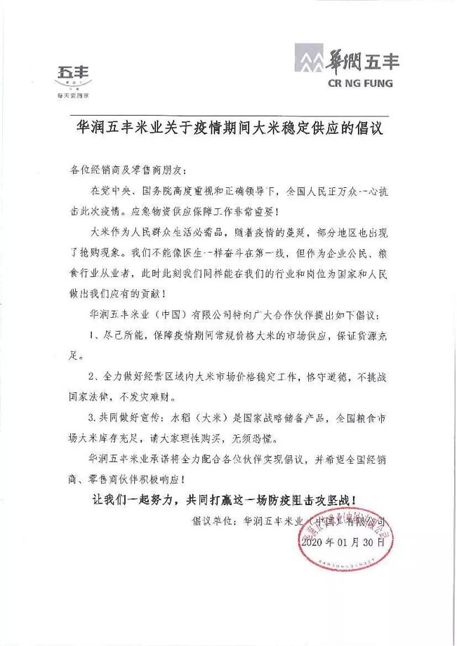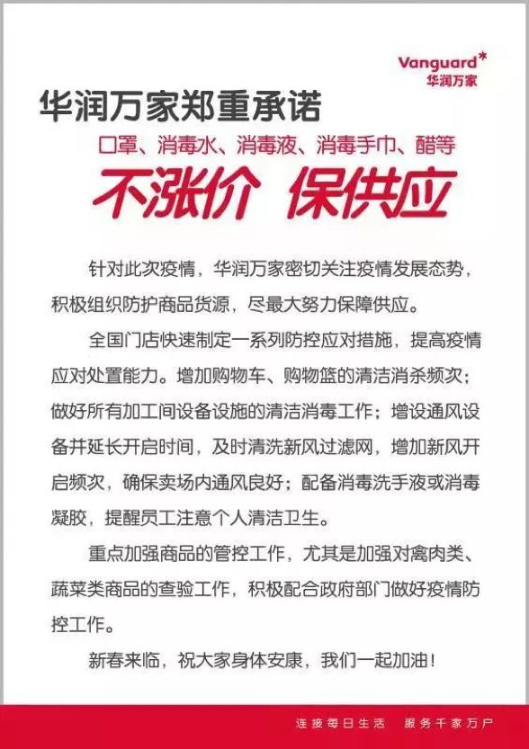 华润集团旗下华润万家、华润五丰等在疫情发生后第一时间发布公告,郑重承诺“不涨价、保供应”。