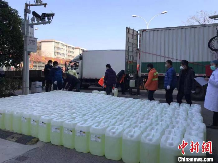 图为1月31日,经武汉大学北京校友会物流组协调配合、宅急送无偿支持,由武汉大学天津校友会捐赠的10吨84消毒液在2天内抵达武汉大学 武汉大学北京校友会供图 摄