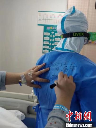 1月27日,一名患者在护士刘思思的防护服上写下了祝福语:“平安喜乐,加油!”“病人的认可,让我们更有力量了。”刘思思说。