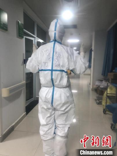 沈杭的防护服背后写上了“沈杭,加油!”(付艳供图)