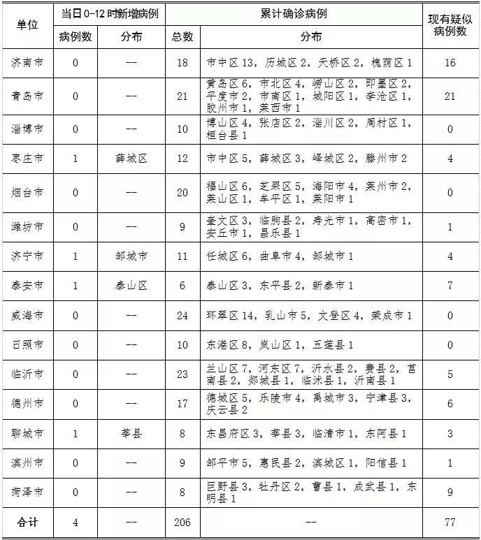 中新网2月1日电 据山东卫健委微信公众号消息,1日0—12时,山东省报告新型冠状病毒感染的肺炎新增确诊病例4例,现有疑似病例77例,累计确诊病例206例(含重症病例12例,危重症病例1例,出院3例,无死亡病例)。