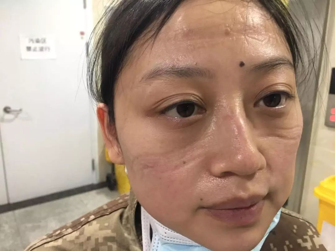 脱下防护服后,脸上被护目镜和面屏压出的印痕。