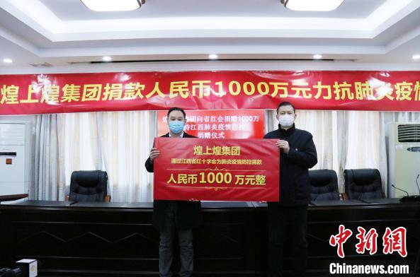 1月29日,煌上煌集团捐款人民币1000万元力抗疫情捐赠仪式在江西省红十字会举行。这是疫情发生以来,该省接到的最大一笔捐款,将全部专项用于购置医用防护服、医用外科口罩、一次性手术服、防护脸罩、护目镜等急需医疗物资、医疗器具及医疗设施建设。 江西省红十字会 摄