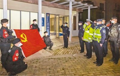 2月1日,武汉市火神山医院警务室挂牌成立。当晚,警务室组建了8人组成的党员突击队,成员们在党旗前宣誓。本报记者 张武军摄