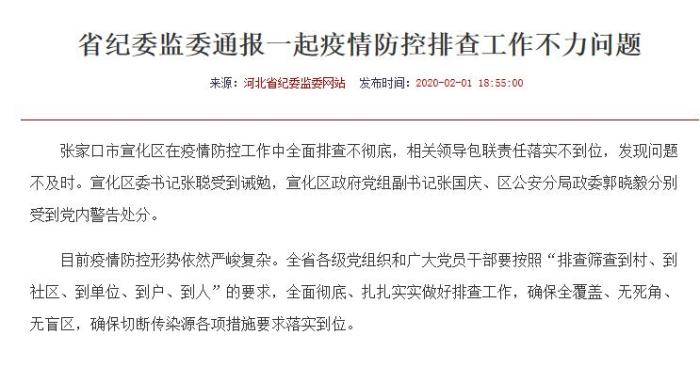 中新网2月2日电 据河北省纪委监委网站消息,张家口市宣化区在疫情防控工作中全面排查不彻底,相关领导包联责任落实不到位,发现问题不及时。宣化区委书记张聪受到诫勉,宣化区政府党组副书记张国庆、区公安分局政委郭晓毅分别受到党内警告处分。