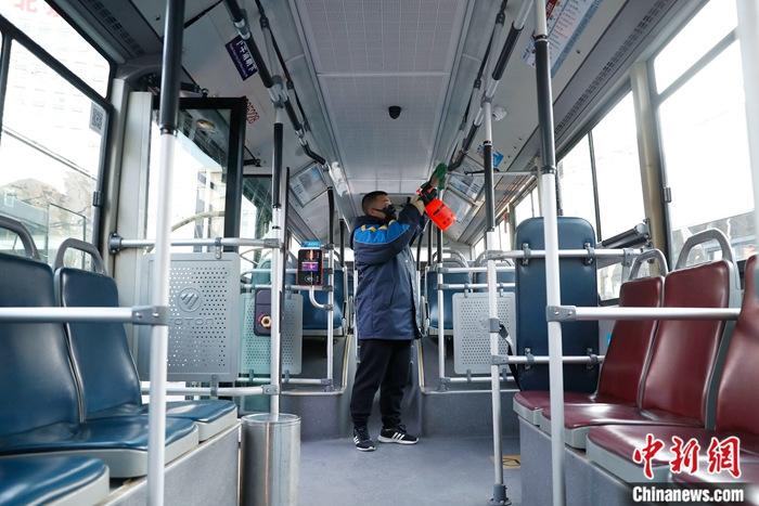 1月23日,工作人员对公交车扶手进行消毒。中新社记者 韩海丹 摄