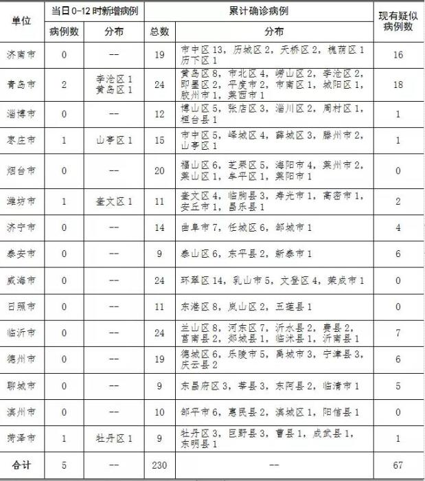中新网2月2日电 据山东卫健委网站消息,2020年2月2日0—12时,山东省报告新型冠状病毒感染的肺炎新增确诊病例5例,现有疑似病例67例,累计确诊病例230例(含重症病例15例,危重症病例1例,出院6例,无死亡病例)。截至目前,追踪到密切接触者7535人,已解除医学观察1232人,诊断为疑似或确诊91例,尚有6212人正在接受医学观察。
