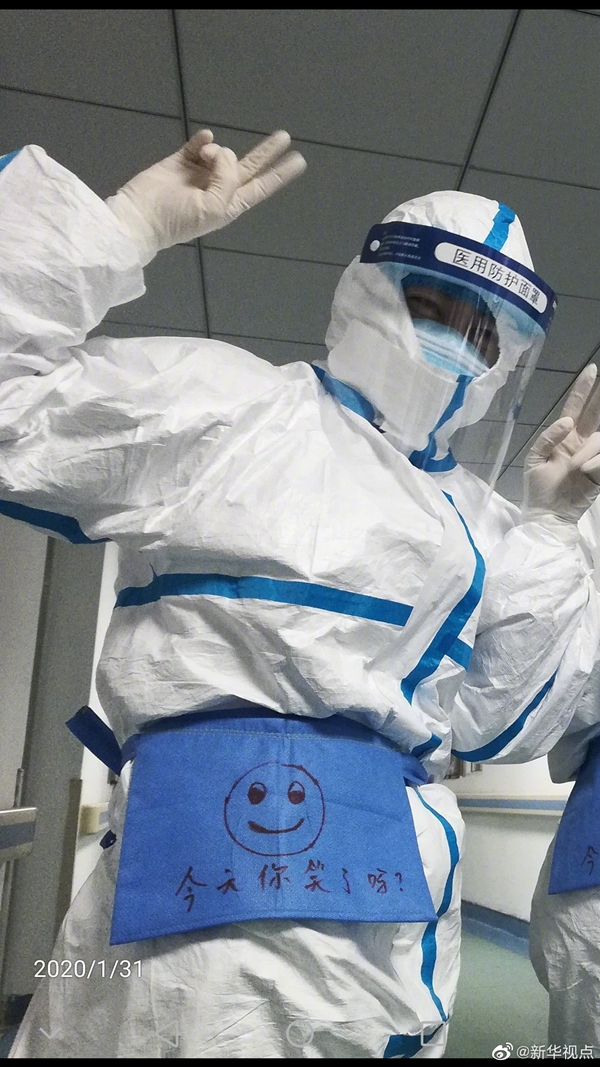 在武汉金银潭医院南四病区,由于防护服是连体的,没有口袋,护士巡视输液时需要签名,笔、对讲机等小件物品没地方放,为了工作方便,科室护士的爸爸妈妈亲手帮他们做了这个“爱心腰包”,护士长吴静还在上面画上了笑脸,鼓励病人和医护人员都要乐观面对。(记者侯文坤、胡喆)