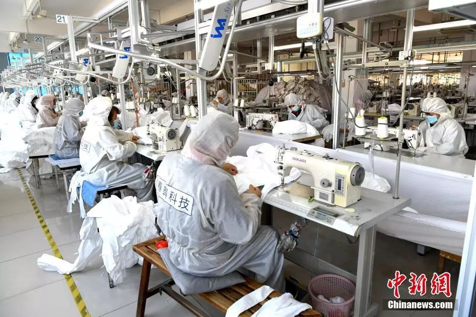 新型冠状病毒感染肺炎疫情发生后,位于福州的福建春晖服装科技有限公司厂区里,正月初三紧急复工,目前开设三条生产线全力赶制防护服。