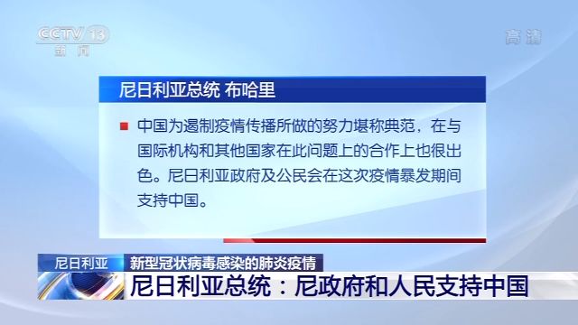 尼日利亚总统布哈里通过发言人发表声明称,中国为遏制疫情传播所做的努力堪称典范,在与国际机构和其他国家在此问题上的合作上也很出色。尼日利亚政府及公民会在这次疫情暴发期间支持中国。