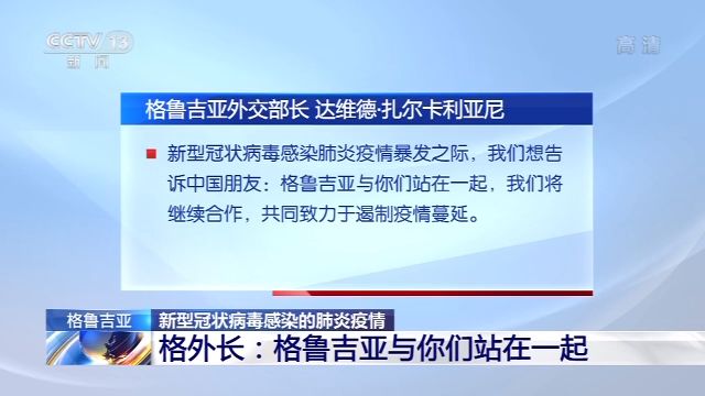 格鲁吉亚外交部长达维德·扎尔卡利亚尼表示,新型冠状病毒感染肺炎疫情暴发之际,我们想告诉中国朋友:格鲁吉亚与你们站在一起,我们将继续合作,共同致力于遏制疫情蔓延。