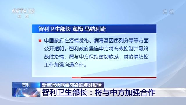 智利卫生部长海梅·马纳利奇表示,中国政府在疫情发布、病毒基因序列分享等方面公开透明。智利政府坚信中方将有效控制并最终战胜疫情,愿与中方保持密切联系,就疫情防控工作加强沟通合作。
