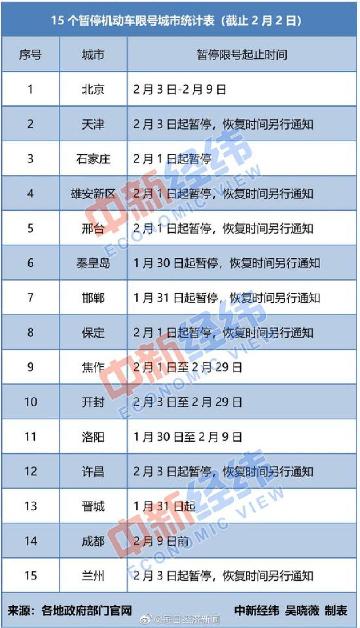 对部分上班族来说,3日是正式复工的第一天。为了减少人员聚集和交叉感染,阻断疫情传播,近日北京、天津、石家庄、雄安新区、邢台、秦皇岛、邯郸、保定、焦作、开封、洛阳、许昌、晋城、成都、兰州共15城发布了暂停机动车尾号限行的措施,减少民众公共交通出行。