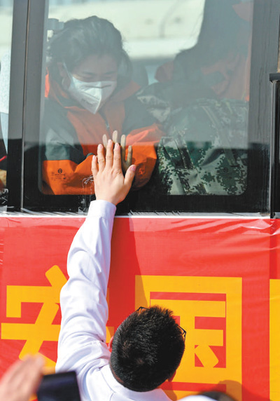 2月3日,西安国际医学中心医院援鄂医疗队队员与同事隔窗告别。