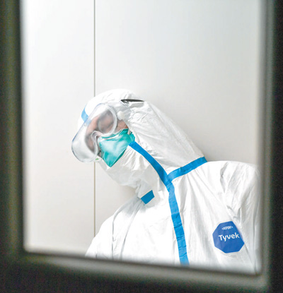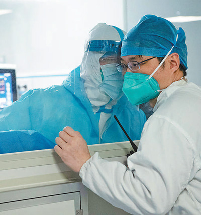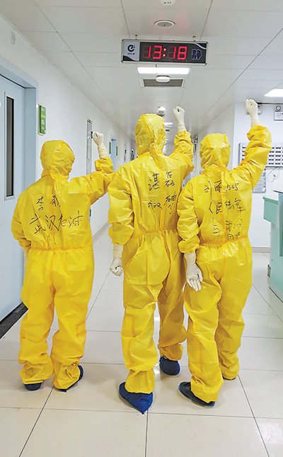 1月30日,在重症监护室值守的海军军医大学医疗队医护人员相互鼓劲打气。