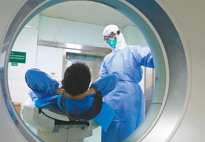 2月2日,武汉大学中南医院医学影像科技师为患者做检查。