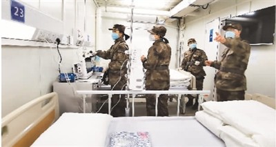 医院病房内,军队医务工作者正在紧张调试各种医疗设备。