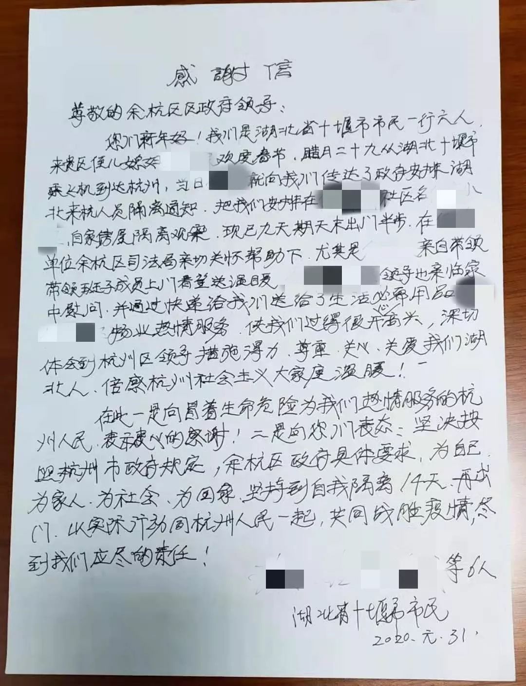 俞丽月,杭州市余杭区司法局党委书记、局长,党龄20年。1月31日下午,她自己跑去药店备了一些消毒用品、生活用品,带着一名年轻小党员去走访慰问了目前正在居家隔离的干部及湖北籍亲属。“还缺高血压药吗?”“现在情况都稳定吗?”“安心度过隔离期”......这次探望让正在隔离的他们非常感动,手写了一封感谢信,希望一定转达给政府。