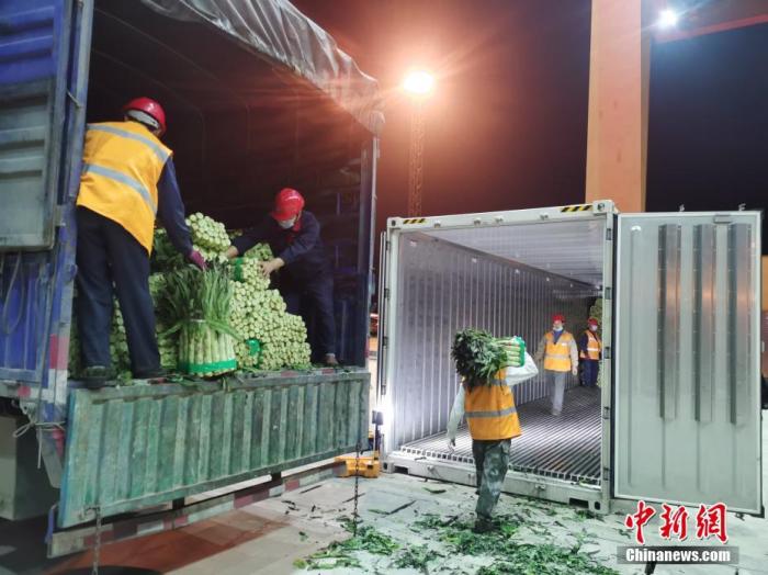 1月30日,首列满载200多吨的西红柿、西葫芦、辣椒、包菜、莴笋、竹筒青菜、毛节瓜、海鸭蛋等8种广西优质蔬菜、禽蛋的果蔬冷链专列,从南宁国际铁路港出发,直奔武汉市吴家山集装箱中心站。中新社记者 林浩 摄