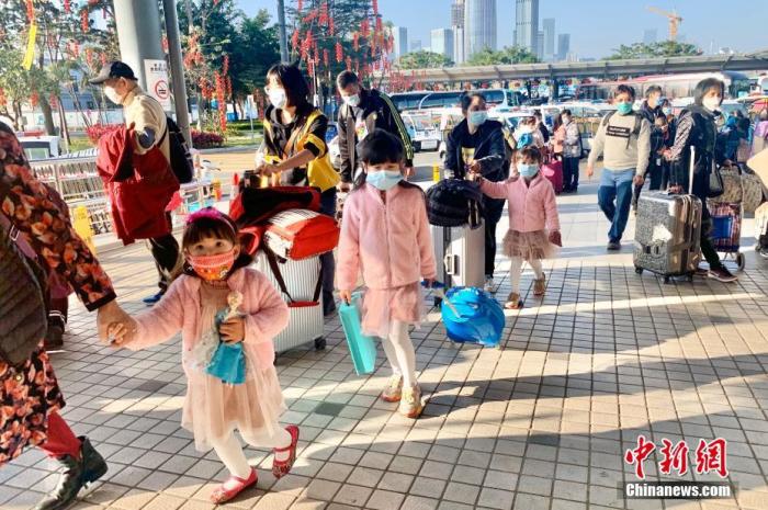 1月30日下午,大人小孩戴上口罩从深圳湾口岸过境,以防受到感染。中新社记者 李志华 摄