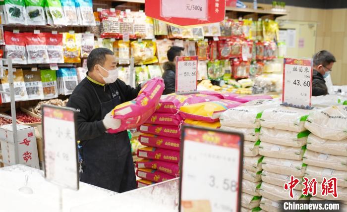 图为江西省新余市一家大型超市内,米面等物资储备充足。 赵春亮 摄