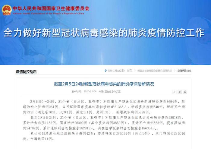 中新网2月6日电 据国家卫健委网站消息,2月5日0~24时,31个省(自治区、直辖市)和新疆生产建设兵团报告新增确诊病例3694例,新增治愈出院病例261例,当日解除医学观察的密切接触者21365人。新增重症病例640例,新增死亡病例73例(湖北省70例、天津1例、黑龙江1例、贵州1例),新增疑似病例5328例。