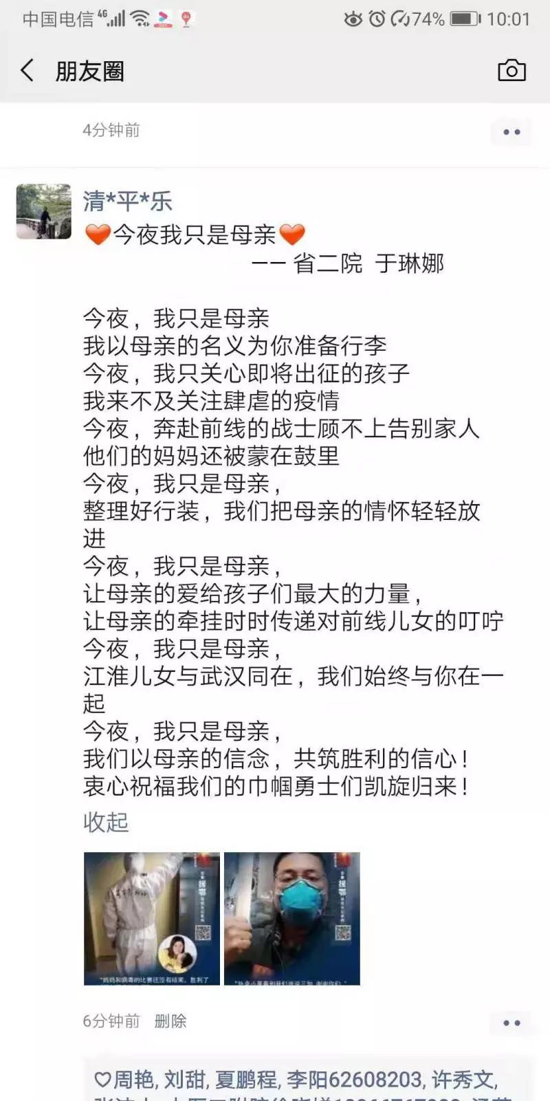 发在朋友圈的诗文——“今夜我只是母亲”!她说,“今夜,我只是母亲,我们以母亲的信念,共驻胜利的信心”。