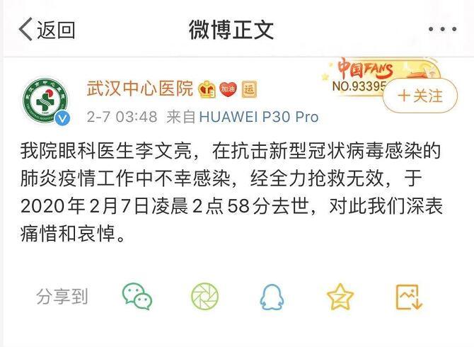 2月7日03:48分,武汉市中心医院官方微博发布消息称,该院眼科医生李文亮,在抗击新型冠状病毒感染的肺炎疫情工作中不幸感染,经全力抢救无效,于2020年2月7日凌晨2点58分去世,对此我们深表痛惜和哀悼。