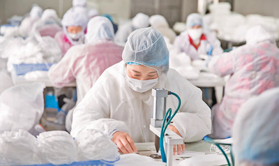 二月六日,江苏省海安市李堡镇广达医材公司生产车间内一片忙碌,工人们正在赶制口罩和防护服。为提高产能,公司将管理人员和其他生产线员工充实到口罩和防护服生产线,加班加点生产,保证重点医用物资供应。