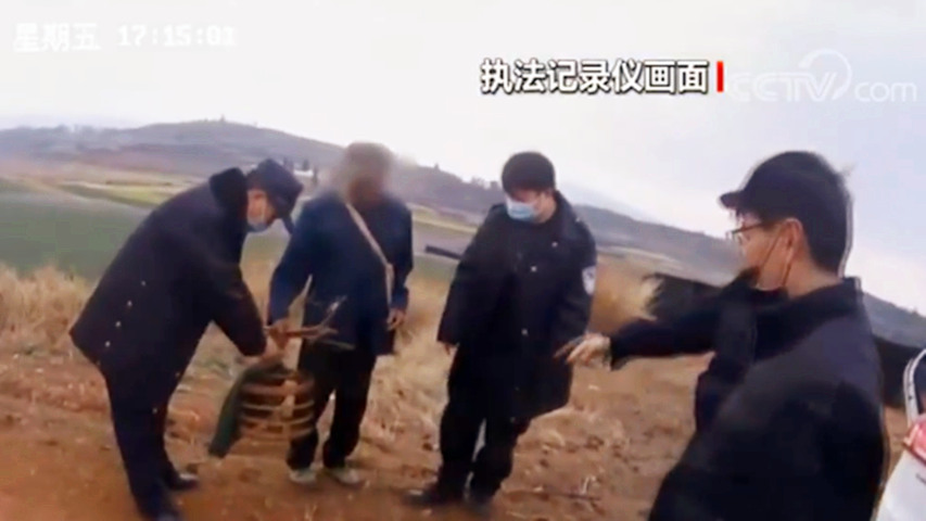 1月31日下午五点,云南玉溪市江川区森林公安局民警对辖区进行巡查时,发现一村民手提猎捕工具,身边还不时传来鸟儿的鸣叫声。