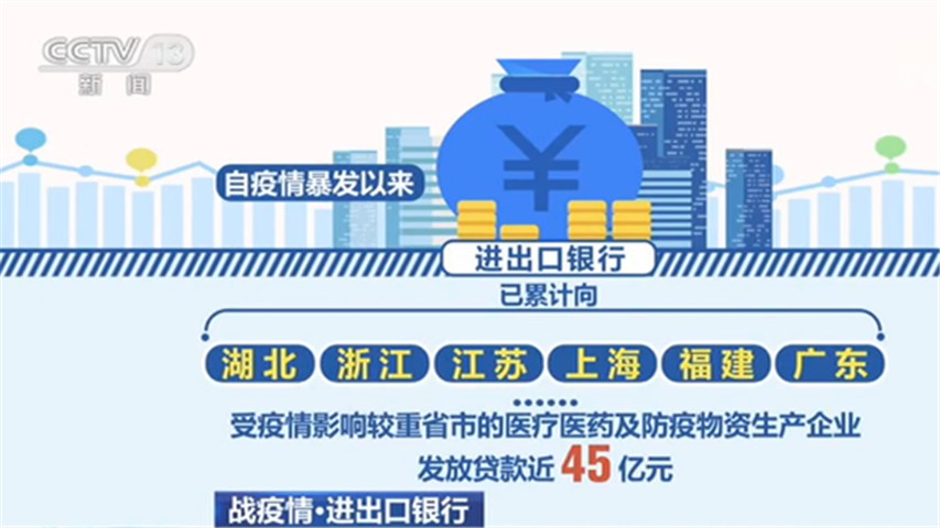 另外自疫情暴发以来,进出口银行已经累计向湖北、浙江、江苏、上海、福建、广东等受疫情影响较重省市的医疗医药及防疫物资生产企业发放贷款近45亿元。同时,发行30亿元抗击疫情主题债券,募集资金全都用于疫情防控相关领域信贷投放。
