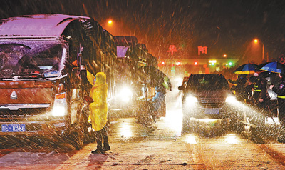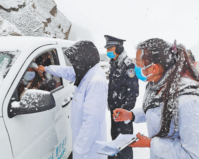 2月3日,云南省会泽县迎来降雪,执勤民警与医护人员在寒冷天气里为驾乘人员测体温,手冻得通红。
