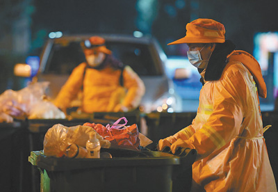 2月1日晚,武汉市江岸环卫集团工作人员在清运生活垃圾。