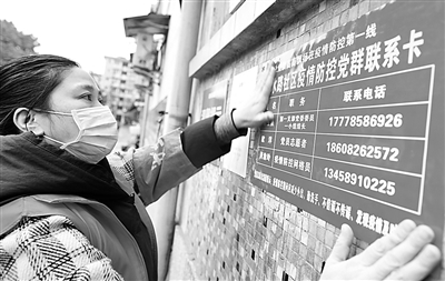 2月3日,四川省华蓥市双河街道渠水路社区的党员志愿者,在小区张贴疫情防控党群联系卡。游青摄/光明图片