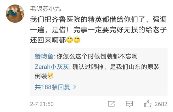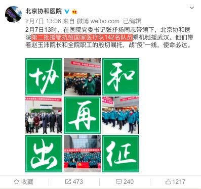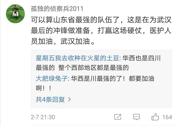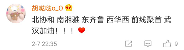 有网友表示,北协和、南湘雅、东齐鲁、西华西,中国医疗界最顶尖的王炸带上各省份的天团会师武汉!今天看到最戳心的一句话是:全村的龙已把最硬的麟给你,哪怕自己也伤痕累累,所以,武汉,加油!